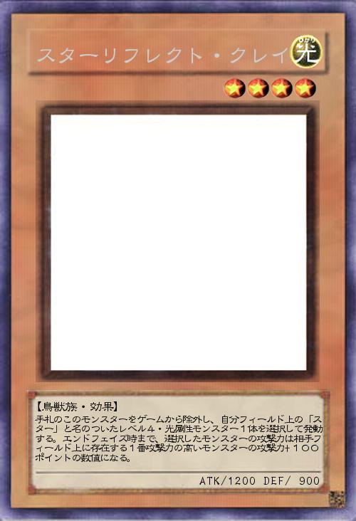 | 手札のこのモンスターをゲームから除外し、自分フィールド上の「スター」と名のついたレベル4・光属性モンスター1体を選択して発動する。エンドフェイズ時まで、選択したモンスターの攻撃力は相手フィールド上に存在する1番攻撃力の高いモンスターの攻撃力+100ポイントの数値になる。 | |||