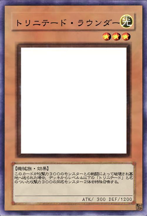 | このカードが攻撃力300のモンスターとの戦闘によって破壊され墓地へ送られた場合、デッキからレベル4以下の「トリニテード」と名のついた攻撃力300の同名モンスター2体を特殊召喚する。 | |||
