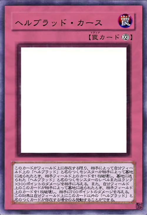 | このカードがフィールド上に存在する限り、相手によって自分フィールド上の「ヘルブラッド」と名のつくモンスターが相手によって墓地に送られたとき、相手フィールド上のカードを1枚破壊し、墓地に送られた「ヘルブラッド」と名のつくモンスターのレベルまたはランク×300ポイントのダメージを相手に与える。また、自分フィールド上のこのカードが相手によって墓地に送られたとき、相手フィールド上のカードを1枚破壊し、相手に700ポイントのダメージを与える。この効果は自分フィールド上にこのカード以外の「ヘルブラッド」と名のつくカードが存在する場合のみ発動することができる。 | |||