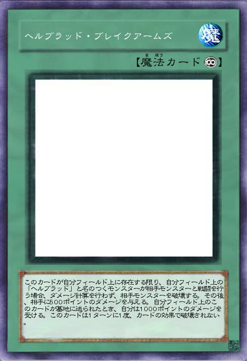 | このカードが自分フィールド上に存在する限り、自分フィールド上の「ヘルブラッド」と名のつくモンスターが相手モンスターと戦闘を行う場合、ダメージ計算を行わず、相手モンスターを破壊する。その後、相手に500ポイントのダメージを与える。自分フィールド上のこのカードが墓地に送られたとき、自分は1000ポイントのダメージを受ける。このカードは1ターンに1度、カードの効果で破壊されない。 | |||