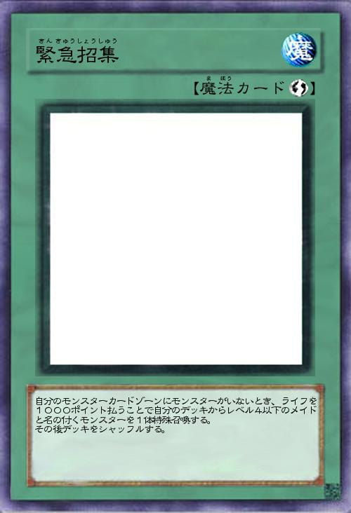 自分のモンスターカードゾーンにモンスターがいないとき、ライフを1000ポイント払うことで自分のデッキからレベル4以下のメイドと名の付くモンスターを1体特殊召喚する。 その後デッキをシャッフルする。 |