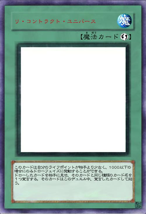 このカードは自分のライフポイントが相手より少なく、1000以下の場合にのみドローフェイズに発動することができる。 ドローしたカードを相手に見せ、そのカードと同じ種類のカード名を1つ宣言する。そのカードはこのデュエル中、宣言したカードして扱う。 |