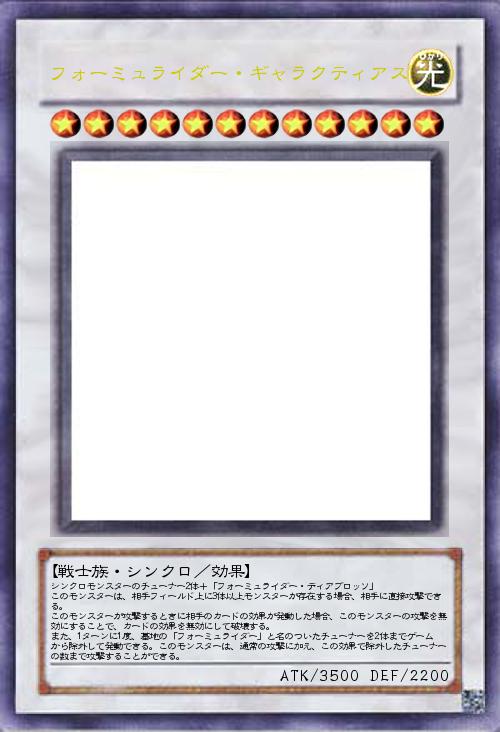 シンクロモンスターのチューナー2体+「フォーミュライダー・ディアブロッソ」 このモンスターは、相手フィールド上に3体以上モンスターが存在する場合、相手に直接攻撃できる。 このモンスターが攻撃するときに相手のカードの効果が発動した場合、このモンスターの攻撃を無効にすることで、カードの効果を無効にして破壊する。 また、1ターンに1度、墓地の「フォーミュライダー」と名のついたチューナーを2体までゲームから除外して発動できる。このモンスターは、通常の攻撃に加え、この効果で除外したチューナーの数まで攻撃することができる。 |