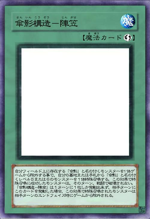 | 自分フィールド上に存在する「傘影」と名の付くモンスターを1体ゲームから除外する事で、自分の墓地または手札から「傘影」と名の付くレベル5または6のモンスターを1体特殊召喚する。この効果で特殊召喚に成功したモンスターは、そのターン、戦闘で破壊されない。「傘影構造-陣傘」は1ターンに1枚しか発動出来ず、相手ターンにこのカードを発動した場合、この効果で特殊召喚されたモンスターは相手ターンのエンドフェイズ時にゲームから除外される。 | |||