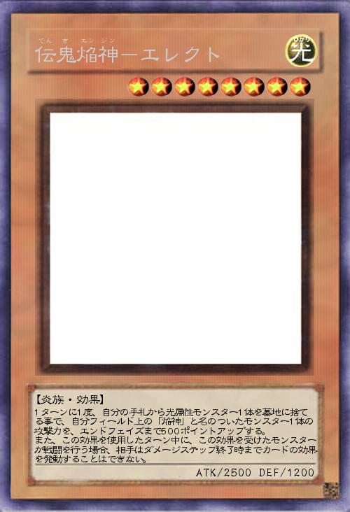 1ターンに1度、自分の手札から光属性モンスター1体を墓地に捨てる事で、自分フィールド上の「焔神」と名のついたモンスター1体の攻撃力を、エンドフェイズまで500ポイントアップする。 また、この効果を使用したターン中に、この効果を受けたモンスターが戦闘を行う場合、相手はダメージステップ終了時までカードの効果を発動することはできない。 |