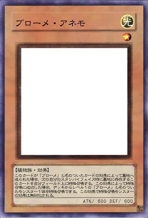 | このカードが「ブローメ」と名のついたカードの効果によって墓地へ送られた場合、次の自分のスタンバイフェイズ時に墓地に存在するこのカードを自分フィールド上に特殊召喚する。この効果によって特殊召喚に成功した場合、デッキからレベル1の「ブローメ」と名のついたモンスター1体を特殊召喚できる。この効果で特殊召喚モンスターの効果は無効化される。 | |||