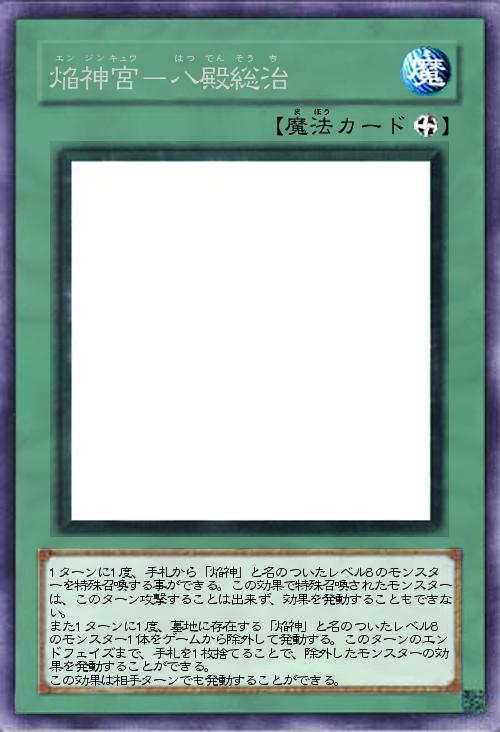 1ターンに1度、手札から「焔神」と名のついたレベル8のモンスターを特殊召喚する事ができる。この効果で特殊召喚されたモンスターは、このターン攻撃することは出来ず、効果を発動することもできない。 また1ターンに1度、墓地に存在する「焔神」と名のついたレベル8のモンスター1体をゲームから除外して発動する。このターンのエンドフェイズまで、手札を1枚捨てることで、除外したモンスターの効果を発動することができる。 この効果は相手ターンでも発動することができる。 |