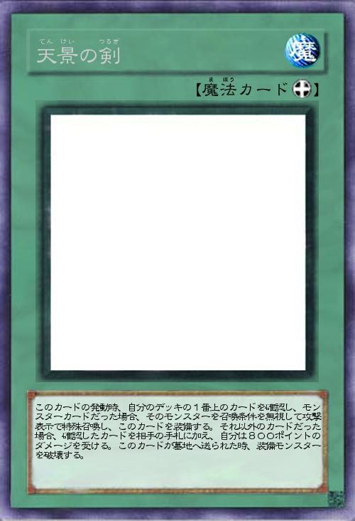 | このカードの発動時、自分のデッキの1番上のカードを確認し、モンスターカードだった場合、そのモンスターを召喚条件を無視して攻撃表示で特殊召喚し、このカードを装備する。それ以外のカードだった場合、確認したカードを相手の手札に加え、自分は800ポイントのダメージを受ける。このカードが墓地へ送られた時、装備モンスターを破壊する。 | |||