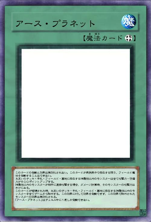 このカードの発動と効果は無効化されない。このカードが表側表示で存在する限り、フィールド魔法を発動することはできない。 お互いのデッキ・手札・フィールド・墓地に存在する神属性以外のモンスターは全て攻撃力・守備力が500ポイントアップする。 神属性以外のモンスターが相手に直接攻撃する場合、ダメージ計算時、そのモンスターの攻撃力は半分になる。 このカードが破壊された時、お互いのデッキ・手札・フィールド・墓地に存在する神属性以外のモンスターを全てゲームから除外する。この効果に対して効果を発動できず、この効果で除外されたモンスターの効果は無効化される。 「アース・プラネット」はデュエル中に1度しか発動できない。 |