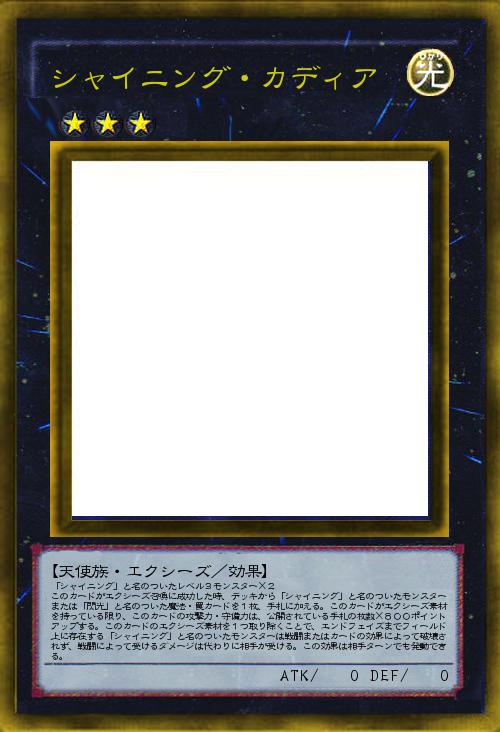 「シャイニング」と名のついたレベル3モンスター×2 このカードがエクシーズ召喚に成功した時、デッキから「シャイニング」と名のついたモンスターまたは「閃光」と名のついた魔法・罠カードを1枚、手札に加える。このカードがエクシーズ素材を持っている限り、このカードの攻撃力・守備力は、公開されている手札の枚数×800ポイントアップする。このカードのエクシーズ素材を1つ取り除くことで、エンドフェイズまでフィールド上に存在する「シャイニング」と名のついたモンスターは戦闘またはカードの効果によって破壊されず、戦闘によって受けるダメージは代わりに相手が受ける。この効果は相手ターンでも発動できる。 |