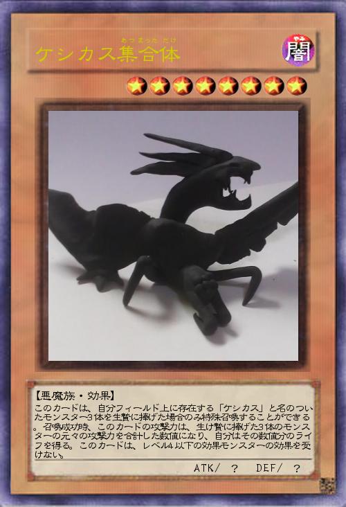 | このカードは、自分フィールド上に存在する「ケシカス」と名のついたモンスター3体を生贄に捧げた場合のみ特殊召喚することができる。召喚成功時、このカードの攻撃力は、生け贄に捧げた3体のモンスターの元々の攻撃力を合計した数値になり、自分はその数値分のライフを得る。このカードは、レベル4以下の効果モンスターの効果を受けない。 | |||