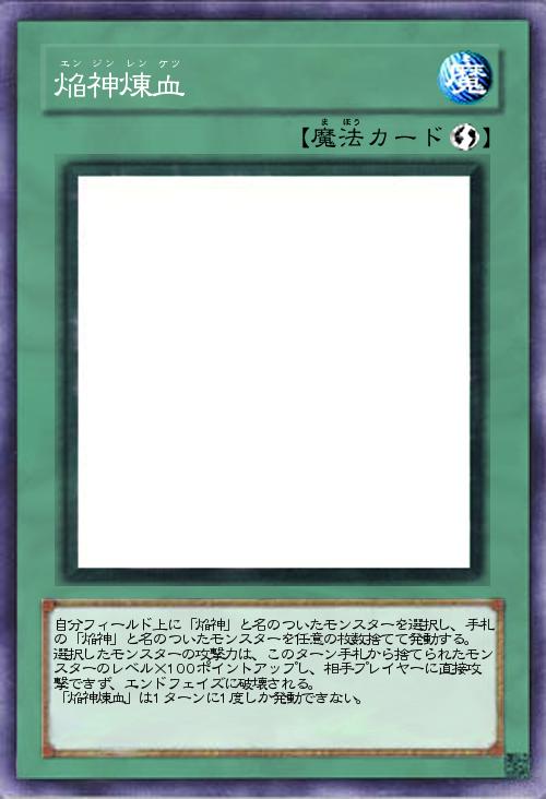 自分フィールド上に「焔神」と名のついたモンスターを選択し、手札の「焔神」と名のついたモンスターを任意の枚数捨てて発動する。 選択したモンスターの攻撃力は、このターン手札から捨てられたモンスターのレベル×100ポイントアップし、相手プレイヤーに直接攻撃できず、エンドフェイズに破壊される。 「焔神煉血」は1ターンに1度しか発動できない。 |