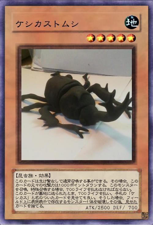 | このカードは生け贄なしで通常召喚する事ができる。その場合、このカードの元々の攻撃力は1000ポイントダウンする。このモンスターを召喚、特殊召喚する場合、700ライフを払わなければならない。このカードが墓地に送られたとき、700ライフを払い、手札の「ケシカス」と名のついたカードを見せても良い。そうした場合、フィールド上に表側表示で存在するモンスター1体を破壊しその後、見せたカードを捨てる。 | |||