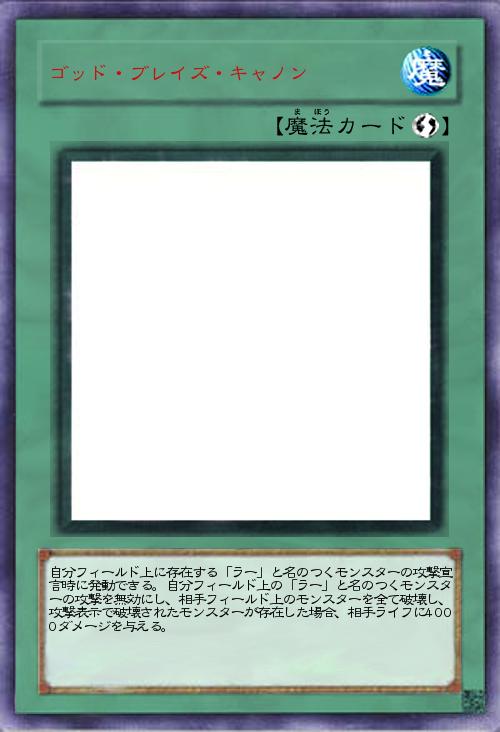 | 自分フィールド上に存在する「ラー」と名のつくモンスターの攻撃宣言時に発動できる。自分フィールド上の「ラー」と名のつくモンスターの攻撃を無効にし、相手フィールド上のモンスターを全て破壊し、攻撃表示で破壊されたモンスターが存在した場合、相手ライフに4000ダメージを与える。 | |||