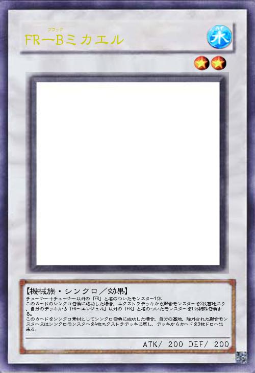 チューナー+チューナー以外の「FR」と名のついたモンスター1体 このカードのシンクロ召喚に成功した場合、エクストラデッキから融合モンスターを2枚墓地にり、自分のデッキから「FRーエンジェル」以外の「FR」と名のついたモンスターを1体特殊召喚する。 このカードをシンクロ素材としてシンクロ召喚に成功した場合、自分の墓地、除外された融合モンスター又はシンクロモンスターを4枚エクストラデッキに戻し、デッキからカードを3枚ドロー出来る。 |