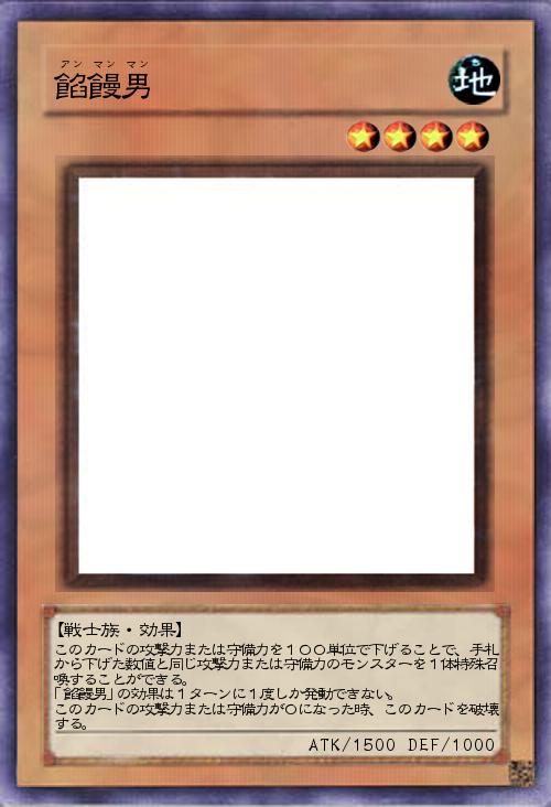 このカードの攻撃力または守備力を100単位で下げることで、手札から下げた数値と同じ攻撃力または守備力のモンスターを1体特殊召喚することができる。 「餡饅男」の効果は1ターンに1度しか発動できない。 このカードの攻撃力または守備力が0になった時、このカードを破壊する。 |