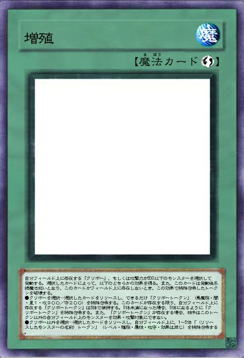 自分フィールド上に存在する「クリボー」、もしくは攻撃力が500以下のモンスターを選択して発動する。選択したカードによって、以下のどちらかの効果を得る。また、このカードは発動後永続魔法扱いとなり、このカードがフィールド上に存在しないとき、この効果で特殊召喚したトークンを破壊する。 ●クリボーを選択…選択したカードをリリースし、できるだけ「クリボートークン」(悪魔族・闇・星1・攻300/守200)を特殊召喚する。このカードが存在する限り、自分フィールド上に存在する「クリボートークン」は5体で維持する。5体未満になった場合、5体になるように「クリボートークン」を特殊召喚する。また、「クリボートークン」が存在する場合、相手はこのトークン以外の自分フィールド上のモンスターを効果・攻撃対象にできない。 ●クリボー以外を選択…選択したカードをリリースし、自分フィールド上に、1~5体「(リリースしたモンス |