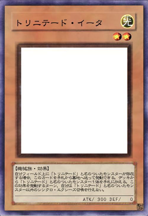 | 自分フィールド上に「トリニテード」と名のついたモンスターが存在する場合、このカードを手札から墓地へ送って発動できる。デッキから「トリニテード」と名のついたモンスター1体を手札に加える。この効果を発動するターン、自分は「トリニテード」と名のついたモンスター以外のシンクロ・エクシーズ召喚を行えない。 | |||