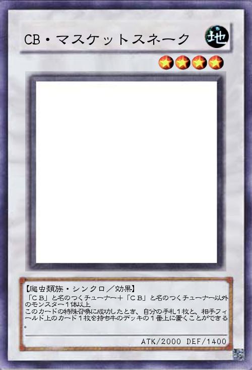 「CB」と名のつくチューナー+「CB」と名のつくチューナー以外のモンスター1体以上 このカードの特殊召喚に成功したとき、自分の手札1枚と、相手フィールド上のカード1枚を持ち牛のデッキの1番上に置くことができる。 |