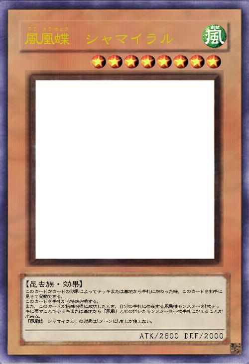 このカードがカードの効果によってデッキまたは墓地から手札に加わった時、このカードを相手に見せて発動できる。 このカードを手札から特殊召喚する。 また、このカードが特殊召喚に成功したとき、自分の手札に存在する風属性モンスターを1枚デッキに戻すことでデッキまたは墓地から「風凰」と名の付いたモンスターを一枚手札に加えることが出来る。 「風凰蝶 シャマイラル」の効果は1ターンに1度しか使えない。 |