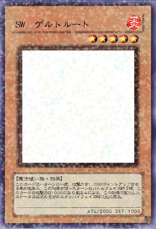 | このカードは一ターンに一度、攻撃力を1,000ポイントアップさせる事が出来る。この効果を使ったターンのバトルフェイズ終了時、このカードの攻撃力は1000になり星は4になる。この効果で変化したステータスは次の自分のスタンバイフェイズ時に元に戻る。 | |||