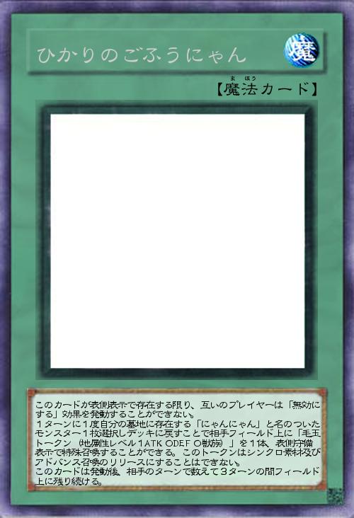 このカードが表側表示で存在する限り、互いのプレイヤーは「無効にする」効果を発動することができない。 1ターンに1度自分の墓地に存在する「にゃんにゃん」と名のついたモンスター1枚選択しデッキに戻すことで相手フィールド上に「毛玉トークン(地属性レベル1ATK0DEF0獣族)」を1体、表側守備表示で特殊召喚することができる。このトークンはシンクロ素材及びアドバンス召喚のリリースにすることはできない。 このカードは発動後、相手のターンで数えて3ターンの間フィールド上に残り続ける。 |