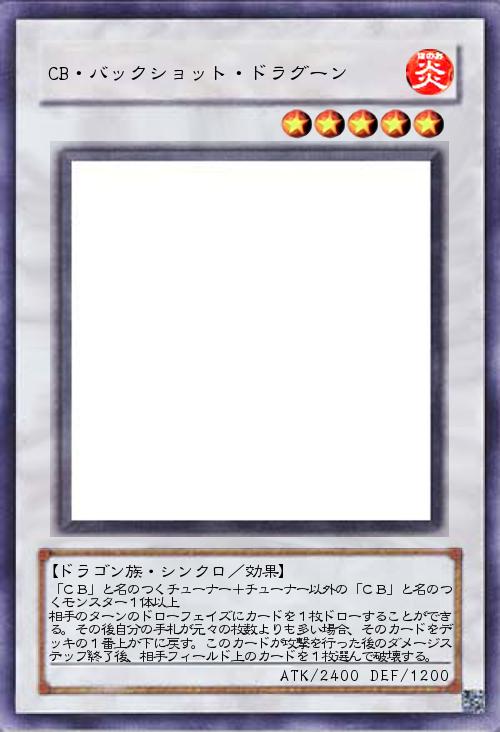 「CB」と名のつくチューナー+チューナー以外の「CB」と名のつくモンスター1体以上 相手のターンのドローフェイズにカードを1枚ドローすることができる。その後自分の手札が元々の枚数よりも多い場合、そのカードをデッキの1番上か下に戻す。このカードが攻撃を行った後のダメージステップ終了後、相手フィールド上のカードを1枚選んで破壊する。 |