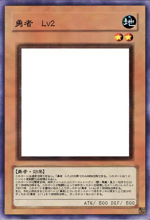このカードは通常召喚できない。「勇者 Lv1」の効果でのみ特殊召喚できる。このカードは1ターンに1度戦闘では破壊されない。 このカードの攻撃宣言時、相手フィールド上にゴーストトークン(闇・悪魔・星2・攻守300)を1体特殊召喚する。このカードが戦闘によって相手モンスターを破壊したターンのバトルフェイズ終了時、このカードを墓地に送ることでデッキから「勇者 Lv4」を1体特殊召喚する。 また、手札に存在するこのカードと「勇者」とついたモンスター1体をデッキに戻すことで自分のデッキから「勇者 Lv1」を1体特殊召喚し、デッキから1枚ドローする。 |