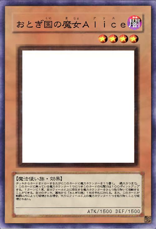 | デッキからカードをドローするたびにこのカードに魔力カウンターを1つ置く。(最大3つまで。)このカードに乗っている魔力カウンター1つにつきこのカードの攻撃力は100ポイントアップする。1ターンに1度、自分フィールド上に存在する魔力カウンターをひとつ取り除いて発動することができる。自分のデッキ、墓地から「おとぎの国」1枚を手札に加える。また、このカードが戦闘以外によって破壊される場合、代りにフィールド上の魔力カウンター1つを取り除くことで破壊されない。 | |||