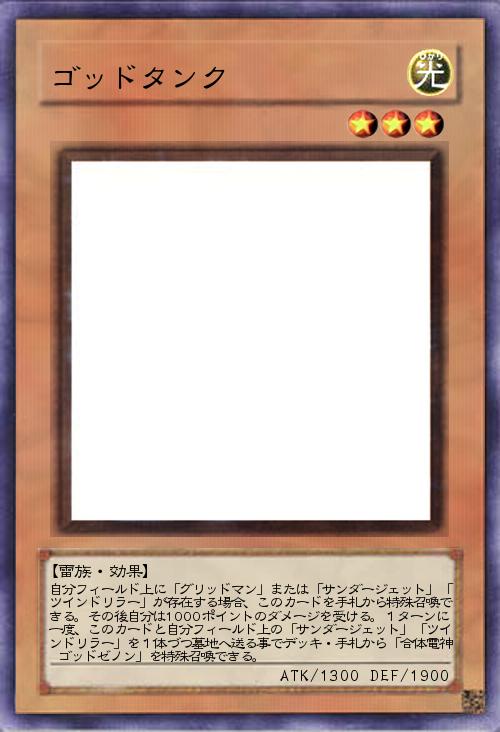 | 自分フィールド上に「グリッドマン」または「サンダージェット」「ツインドリラー」が存在する場合、このカードを手札から特殊召喚できる。その後自分は1000ポイントのダメージを受ける。1ターンに一度、このカードと自分フィールド上の「サンダージェット」「ツインドリラー」を1体づつ墓地へ送る事でデッキ・手札から「合体電神 ゴッドゼノン」を特殊召喚できる。 | |||