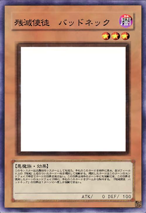 | このモンスターは炎属性モンスターとしても扱う。手札のこのカードを相手に見せ、自分フィールド上の「残滅」と名のついたカード一枚を選択して発動する。選択したカードはこのターンのエンドフェイズ時までカードの効果を受けない。この効果は相手のターン中にも発動でき、この効果を使用したターンのエンドフェイズ時に、手札のこのカードをゲームから除外する。「残滅使徒 バッドネック」の効果は1ターンに一度しか発動できない。 | |||