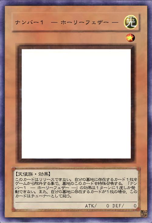 | このカードはリリースできない。自分の墓地に存在するカード1枚をゲームから除外する事で、墓地のこのカードを特殊召喚する。「ナンバー1 ― ホーリーフェザー ―」の効果は1ターンに1度しか発動できない。また、自分の墓地に存在するカードが1枚の場合、このカードはチューナーとして扱う。 | |||