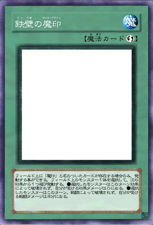 | フィールド上に「魔印」と名のついたカードが存在する場合のみ、発動する事ができる。フィールド上のモンスター1体を選択して、次の効果から1つ選び発動する。●選択したモンスターはこのターン効果によって破壊されず、自分が受ける効果ダメージは0になる。●選択したモンスターはこのターン、戦闘によって破壊されず、自分が受ける戦闘ダメージは半分になる。 | |||