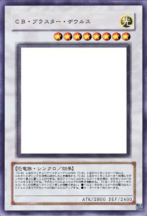 「CB」と名のつくチューナー+チューナー以外の「CB」と名のつくモンスター1体以上 このカードがシンクロ召喚に成功したとき墓地から「CB」と名のつくモンスターを1体選んでデッキの1番上に置くことができる。自分フィールド上のモンスター1体を選び、そのモンスターのレベルを3まで下げる。下げたレベルによって以下の効果を発動する。「CB・ブラスター・ザウルス」のこの効果は1ターンに1度しか発動できない。●1以上:そのモンスターの攻撃力はエンドフェイズまで下げたレベルの数×400アップする。●3:カードを1枚ドローする。 |