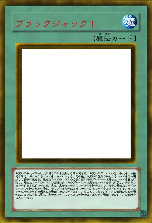 | お互いの手札が3枚以上の場合にのみ発動する事ができる。お互いのプレイヤーは、手札を1枚捨てる事で、デッキからカードを1枚ドローする。その後、お互いに自身の手札からカードを2枚選択して相手に見せる。見せたカードのレベルの合計が低い方のプレイヤーは見せたカードを墓地に送り、見せたカードのレベルの合計が多い方のプレイヤーは見せたカードを手札に戻し、デッキからカードを1枚ドローする。また、見せたカードのレベルの合計が21で、相手の見せたカードのレベルの合計より多い場合、そのプレイヤーはさらにデッキからカードを2枚ドローする。モンスター以外のカードを選択した場合、そのカードはレベルを0として扱う。レベルの合計が同じの場合はお互いに手札に戻す。見せたカードのレベルの合計が21より多い場合、そのレベルの合計を0として扱う。 | |||