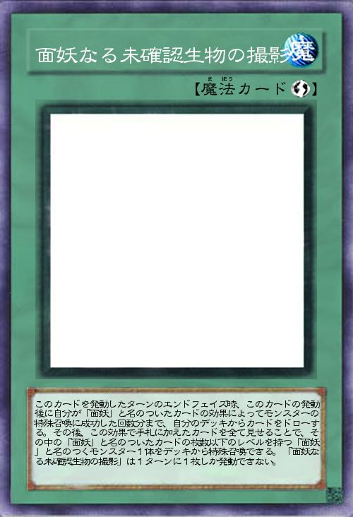 | このカードを発動したターンのエンドフェイズ時、このカードの発動後に自分が「面妖」と名のついたカードの効果によってモンスターの特殊召喚に成功した回数分まで、自分のデッキからカードをドローする。その後、この効果で手札に加えたカードを全て見せることで、その中の「面妖」と名のついたカードの枚数以下のレベルを持つ「面妖」と名のつくモンスター1体をデッキから特殊召喚できる。「面妖なる未確認生物の撮影」は1ターンに1枚しか発動できない。 | |||