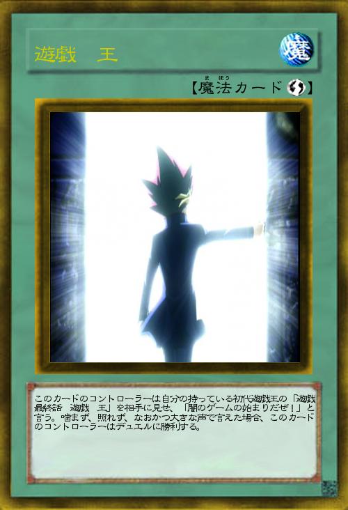 | このカードのコントローラーは自分の持っている初代遊戯王の「遊戯最終話 遊戯 王」を相手に見せ、「闇のゲームの始まりだぜ!」と言う。噛まず、照れず、なおかつ大きな声で言えた場合、このカードのコントローラーはデュエルに勝利する。 | |||