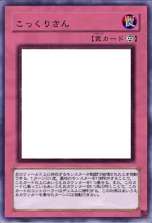 | 自分フィールド上に存在するモンスターが戦闘で破壊されたとき発動できる。1ターンに1度、墓地のモンスターを1体除外することで、このカードの上にあいうえおカウンターを1つ乗せる。また、このカードに乗っているあいうえおカウンターを5つ取り除くことで、このカードのコントローラーはデュエルに勝利する。この効果はあいうえおカウンターを乗せたターンには発動できない。 | |||