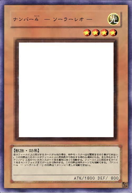 | 自分フィールド上に存分するカードが4枚の場合、相手モンスターは攻撃宣言を行う事ができない。この効果はこのカードがフィールド上に表側表示で存在する時のみ適用される。また手札から「ナンバー」と名のついたモンスター1体を墓地に送って発動する。フィールド上に存在するカード1枚をエンドフェイズまでゲームから除外する。この効果は相手ターンでも発動できる。「ナンバー4 ― ソーラーレオ ―」の効果は1ターンに1度しか発動できない。 | |||