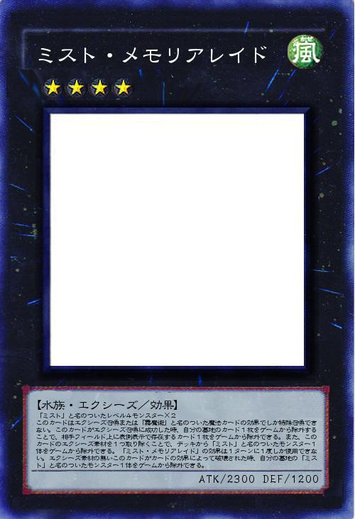 「ミスト」と名のついたレベル4モンスター×2 このカードはエクシーズ召喚または「霧魔術」と名のついた魔法カードの効果でしか特殊召喚できない。このカードがエクシーズ召喚に成功した時、自分の墓地のカード1枚をゲームから除外することで、相手フィールド上に表側表示で存在するカード1枚をゲームから除外できる。また、このカードのエクシーズ素材を1つ取り除くことで、デッキから「ミスト」と名のついたモンスター1体をゲームから除外できる。「ミスト・メモリアレイド」の効果は1ターンに1度しか使用できない。エクシーズ素材の無いこのカードがカードの効果によって破壊された時、自分の墓地の「ミスト」と名のついたモンスター1体をゲームから除外できる。 |