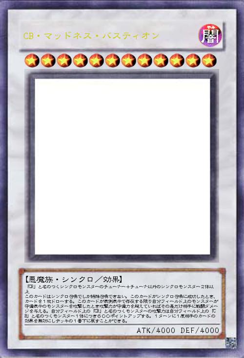 「CB」と名のつくシンクロモンスターのチューナー+チューナ以外のシンクロモンスター2体以上 このカードはシンクロ召喚でしか特殊召喚できない。このカードがシンクロ召喚に成功したとき、カードを1枚ドローする。このカードが表側表示で存在する限り自分フィールド上のモンスターが守備表示のモンスターを攻撃したとき攻撃力が守備力を超えていればその差だけ相手に戦闘ダメージを与える。自分フィールド上の「CB」と名のつくモンスターの攻撃力は自分フィールド上の「CB」と名のつくモンスター1体につき600ポイントアップする。1ターンに1度相手のカードの効果を無効にしデッキの1番下に戻すことができる。 |
