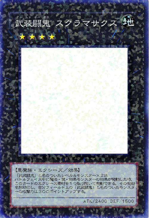 「武装闘鬼」と名のついたレベル4モンスター×2体 バトルフェイズ中に魔法・罠・効果モンスターの効果が発動した時、このカードのエクシーズ素材を1つ取り除いて発動できる。その発動を無効にし、自分フィールド上の「武装闘鬼」と名のついたモンスターの攻撃力は300ポイントアップする。 |