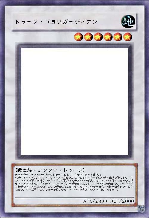 チューナー+チューナー以外のトゥーンと名のつくモンスター1体以上 相手フィールド上にトゥーンモンスターが存在しないときこのカードは相手に直接攻撃できる。このカードが攻撃する場合このカードの攻撃力は相手フィールド上のモンスター1体につき300ポイントダウンする。「トゥーン・ワールド」が破壊されたときこのカードを破壊する。このカードが相手モンスターを先頭によって破壊したとき、そのモンスターを守備表示で特殊召喚することができる。この効果によって特殊召喚したモンスターの効果はこのターン使用できない。 |
