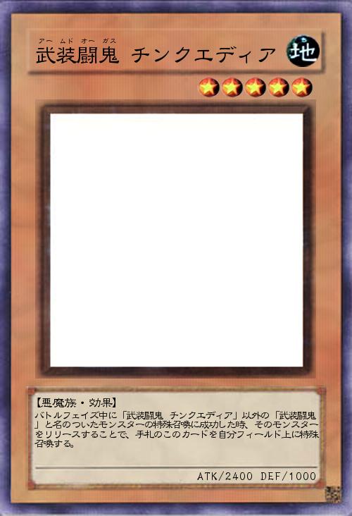 | バトルフェイズ中に「武装闘鬼 チンクエディア」以外の「武装闘鬼」と名のついたモンスターの特殊召喚に成功した時、そのモンスターをリリースすることで、手札のこのカードを自分フィールド上に特殊召喚する。 | |||
