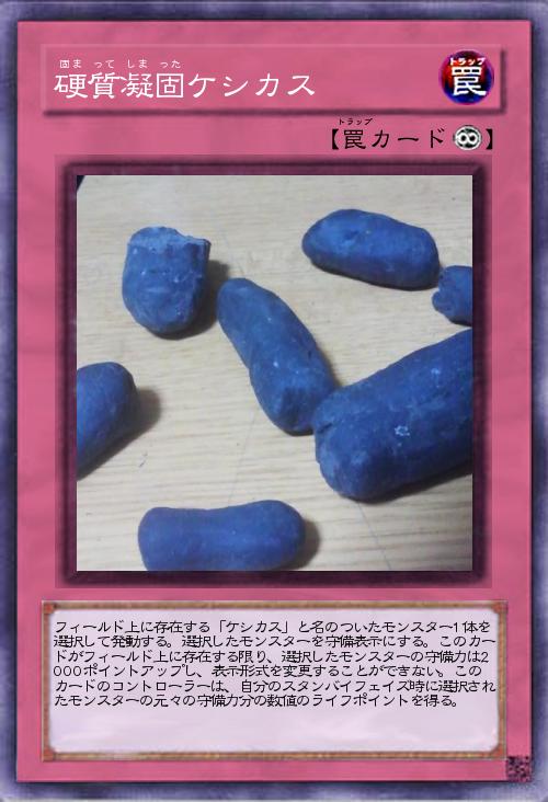| フィールド上に存在する「ケシカス」と名のついたモンスター1体を選択して発動する。選択したモンスターを守備表示にする。このカードがフィールド上に存在する限り、選択したモンスターの守備力は2000ポイントアップし、表示形式を変更することができない。このカードのコントローラーは、自分のスタンバイフェイズ時に選択されたモンスターの元々の守備力分の数値のライフポイントを得る。 | |||