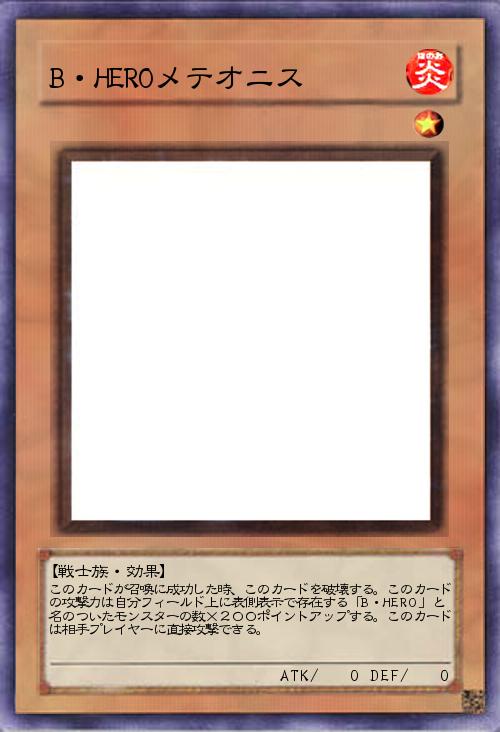 | このカードが召喚に成功した時、このカードを破壊する。このカードの攻撃力は自分フィールド上に表側表示で存在する「B・HERO」と名のついたモンスターの数×200ポイントアップする。このカードは相手プレイヤーに直接攻撃できる。 | |||