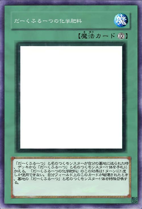 | 「だーくふるーつ」と名のつくモンスターが自分の墓地に送られた時、デッキから「だーくふるーつ」と名のつくモンスター1体を手札に加える。「だーくふるーつの化学肥料」のこの効果は1ターンに1度しか使用できない。自分フィールド上のこのカードが破壊されたとき、墓地の「だーくふるーつ」と名のつくモンスター1体を特殊召喚する。 | |||
