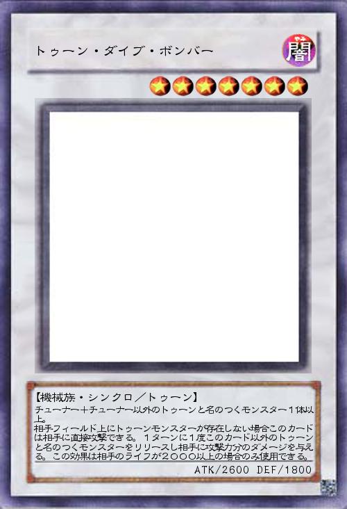 チューナー+チューナー以外のトゥーンと名のつくモンスター1体以上。 相手フィールド上にトゥーンモンスターが存在しない場合このカードは相手に直接攻撃できる。1ターンに1度このカード以外のトゥーンと名のつくモンスターをリリースし相手に攻撃力分のダメージを与える。この効果は相手のライフが2000以上の場合のみ使用できる。 |