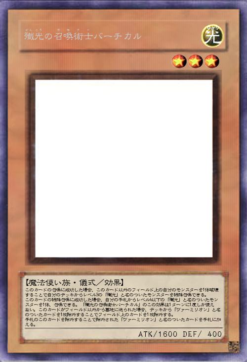 このカードの召喚に成功した場合、このカード以外のフィールド上の自分のモンスターを1体破壊することで自分のデッキからレベル3の「殱光」と名のついたモンスターを特殊召喚できる。 このカードの特殊召喚に成功した場合、自分の手札からレベル4以下の「殱光」と名のついたモンスターを1体、召喚できる。「殱光の召喚術士バーチカル」のこの効果は1ターンに1度しか使えない。このカードがフィールド以外から墓地に送られた場合、デッキから「ヴァーミリオン」と名のついたカードを1枚除外することでフィールド上のカードを1枚除外する。 手札のこのカードを除外することで除外された「ヴァーミリオン」と名のついたカードを手札に加える。 |