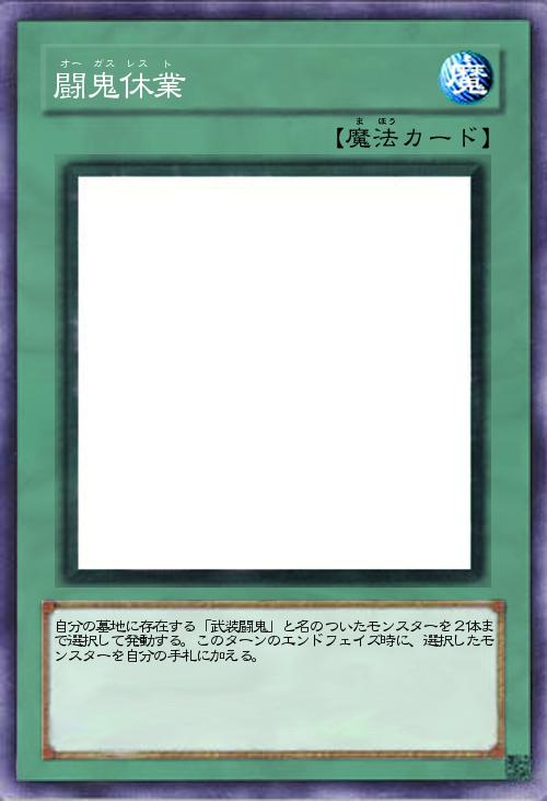 | 自分の墓地に存在する「武装闘鬼」と名のついたモンスターを2体まで選択して発動する。このターンのエンドフェイズ時に、選択したモンスターを自分の手札に加える。 | |||
